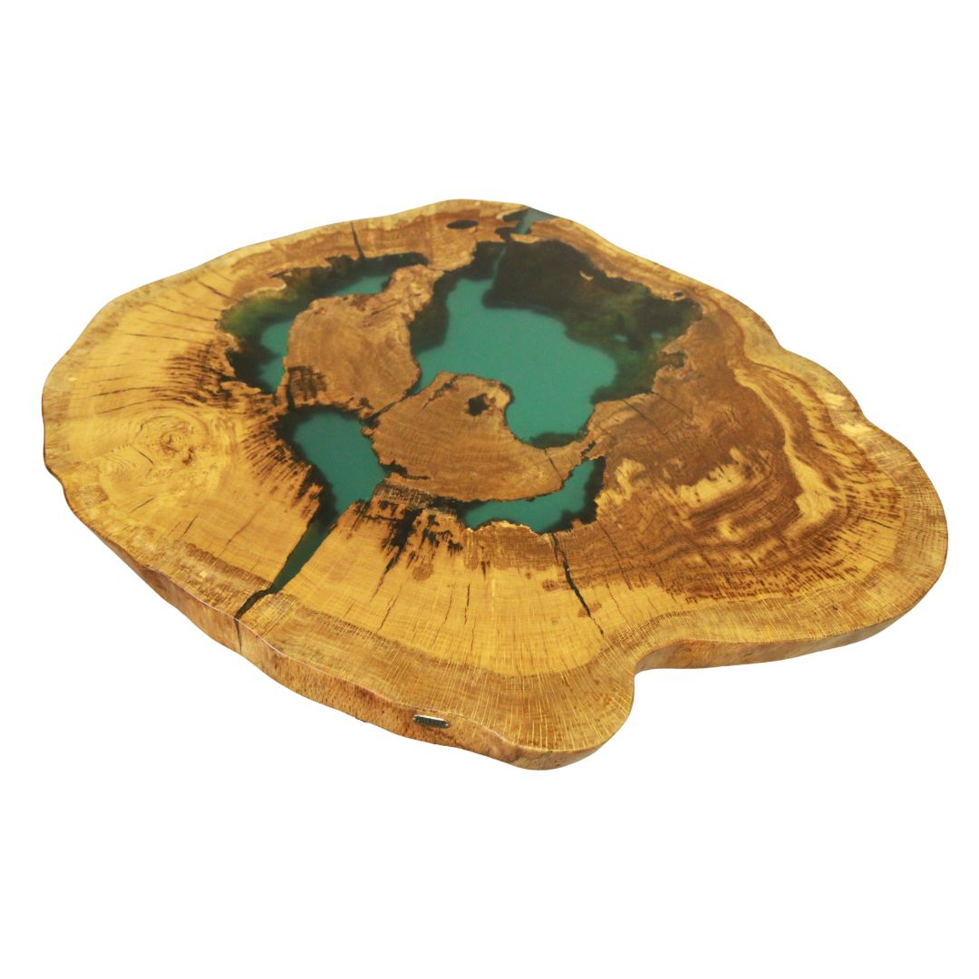 This Coffee Table in Oak Wood and Green Resin – Unique Design, is handmade in solid wood, enhanced with resin with green tones that evoke serene aquatic landscapes. The contrast between the natural oak and the translucent resin creates a unique piece with a soft-touch, durable finish.