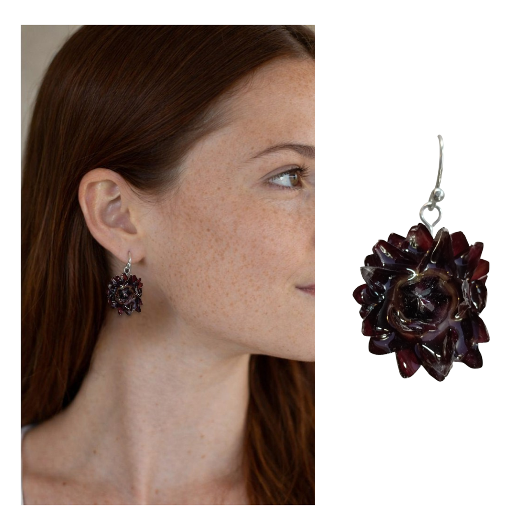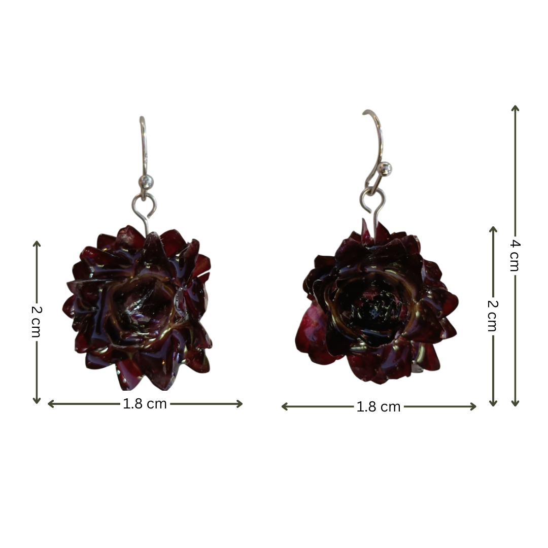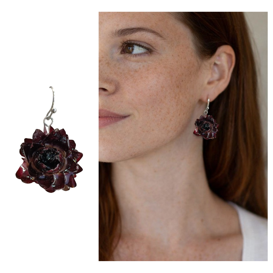Estes brincos são feitos com flores naturais em tom Bordeaux, cuidadosamente preservadas em resina transparente, criando um acabamento brilhante e cheio de profundidade.
