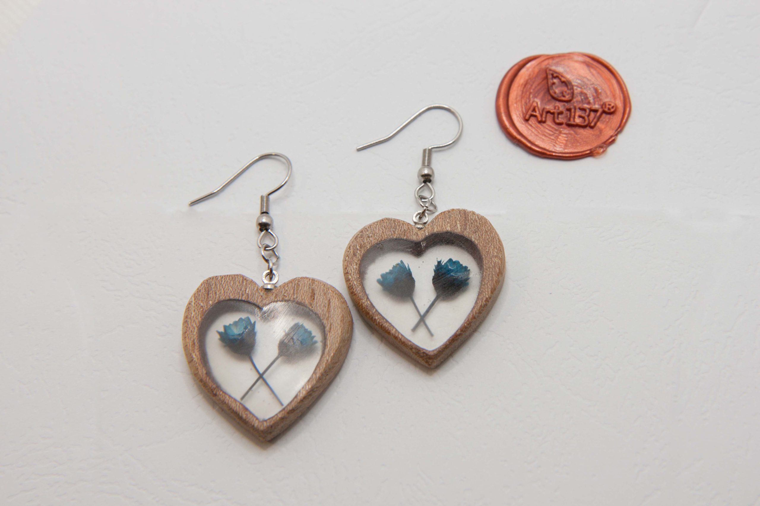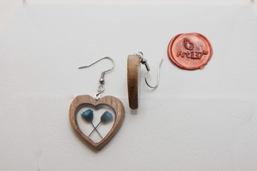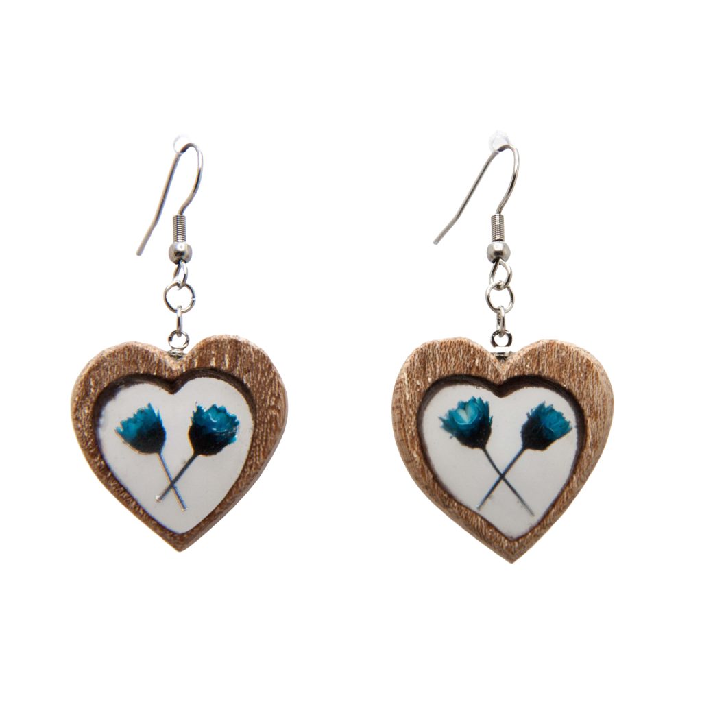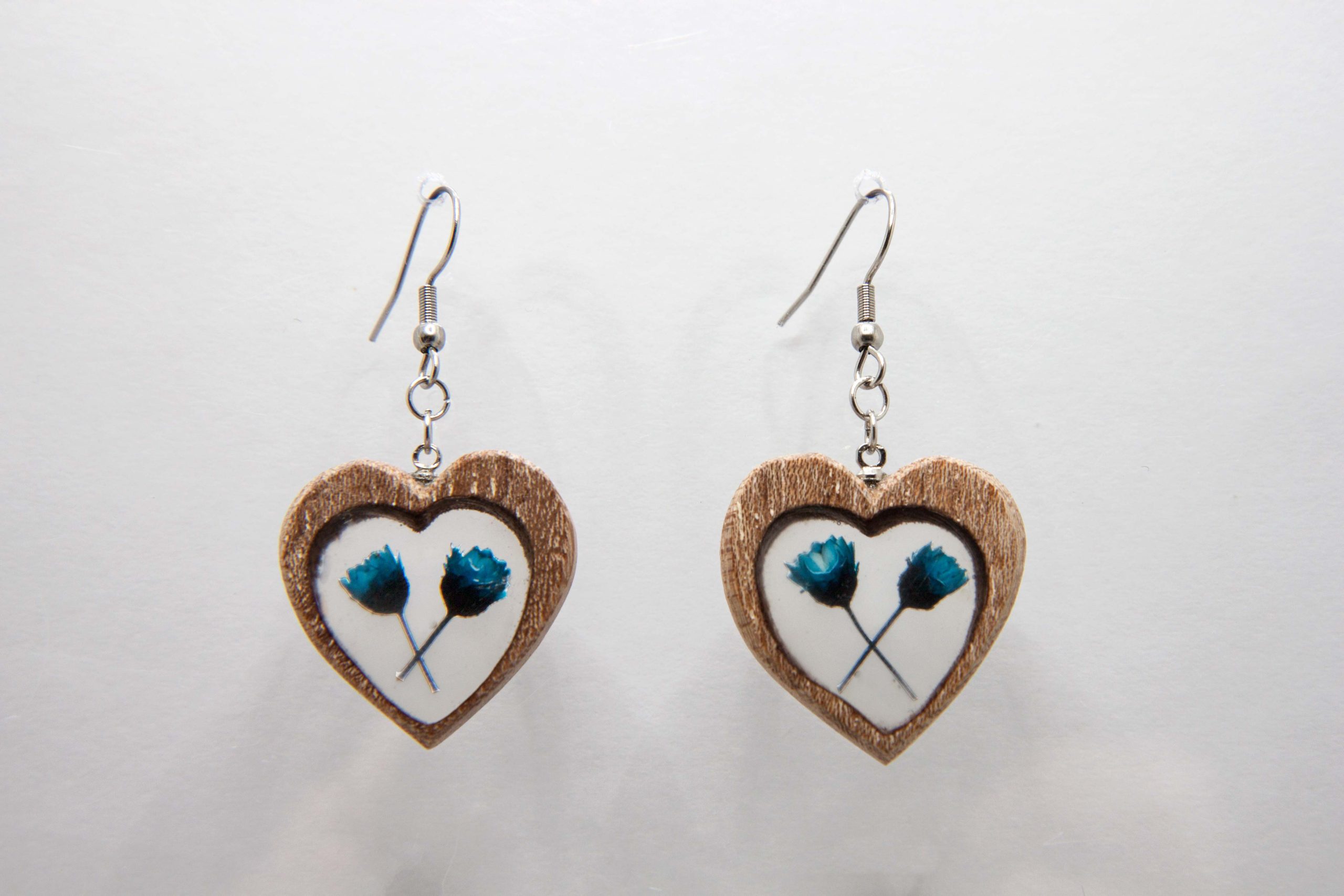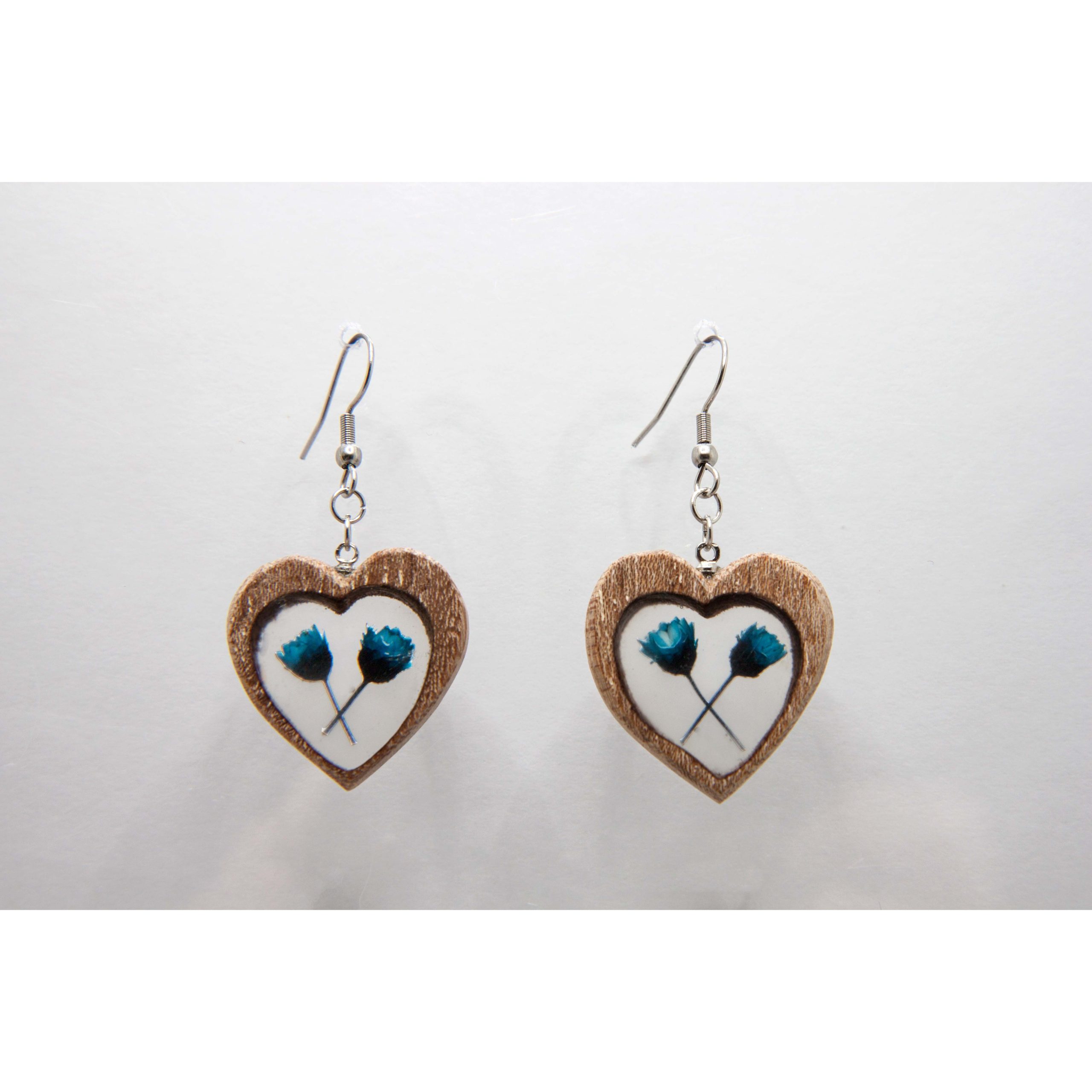 Brincos de Madeira de Olmo com Flor Azul em Resina em formato de Coração | Flos (b34) series