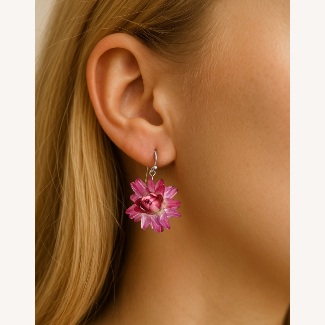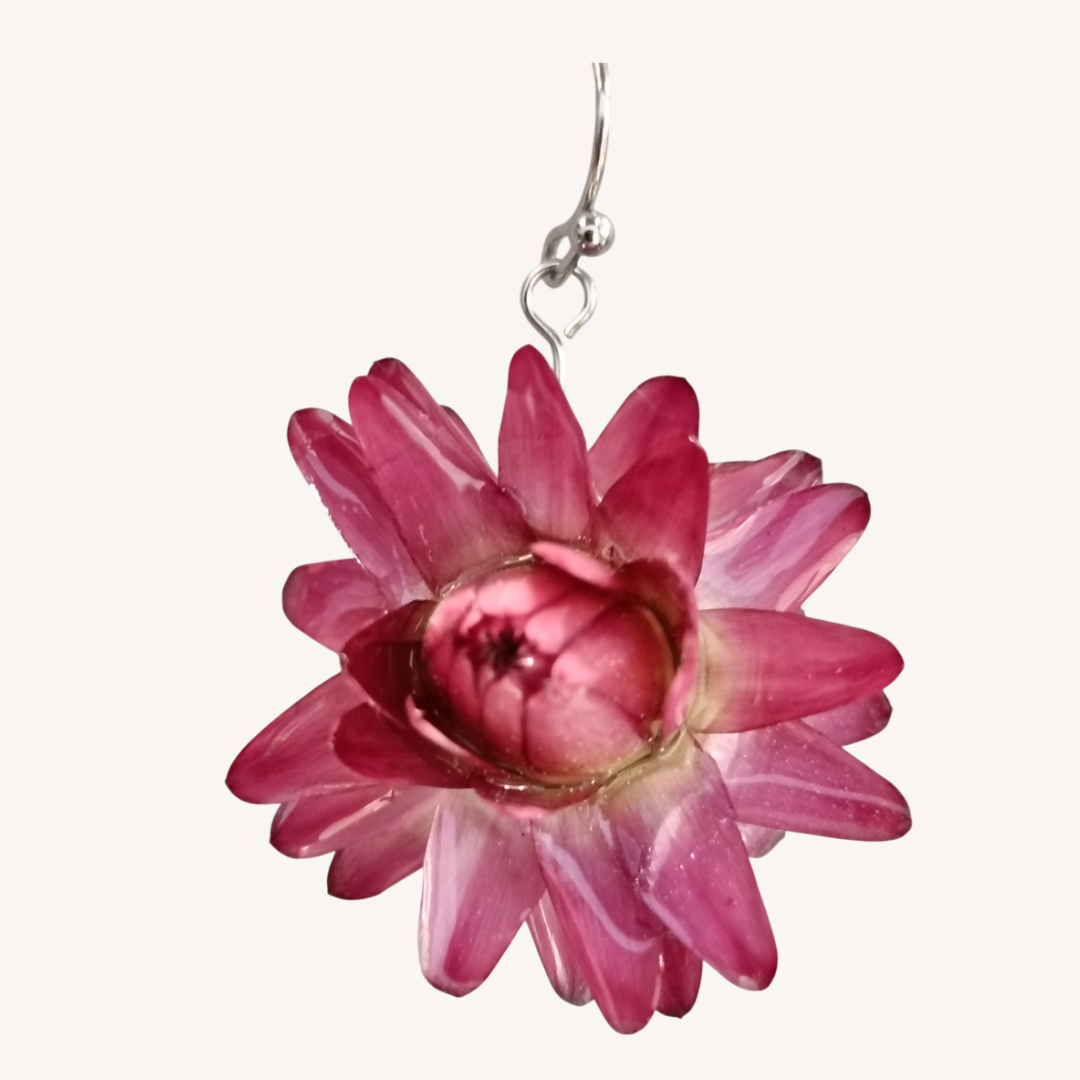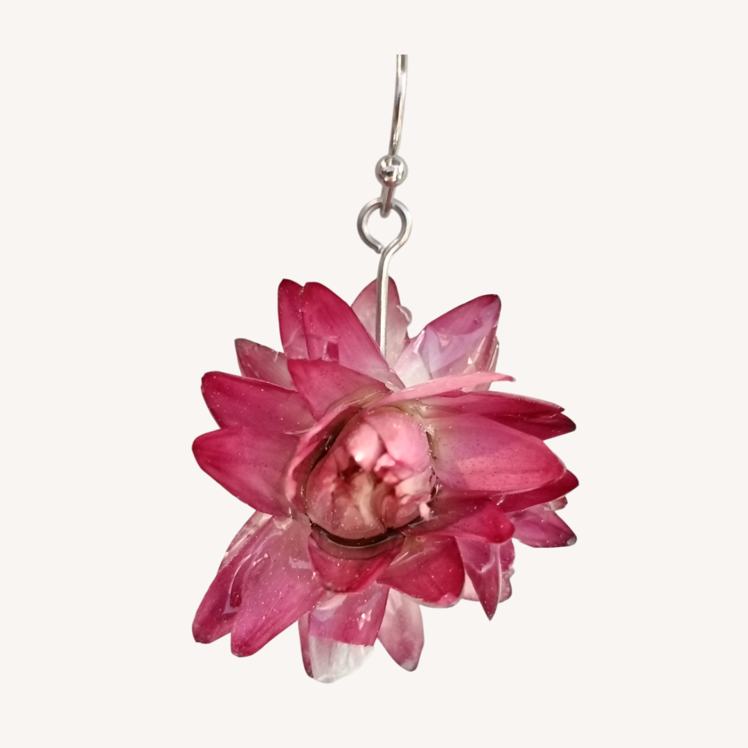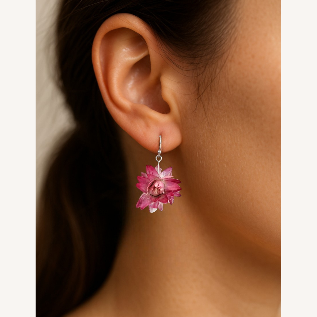 Flores reais cor-de-rosa, preservadas e encapsuladas em resina cristal. Cada par é único — as pétalas e tons variam naturalmente. Leves e confortáveis para o dia a dia.