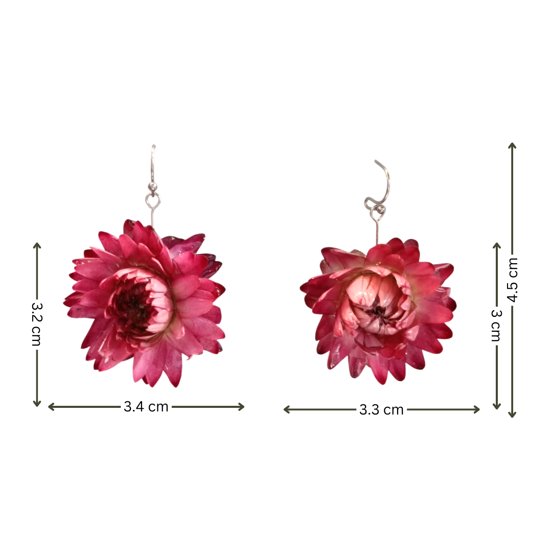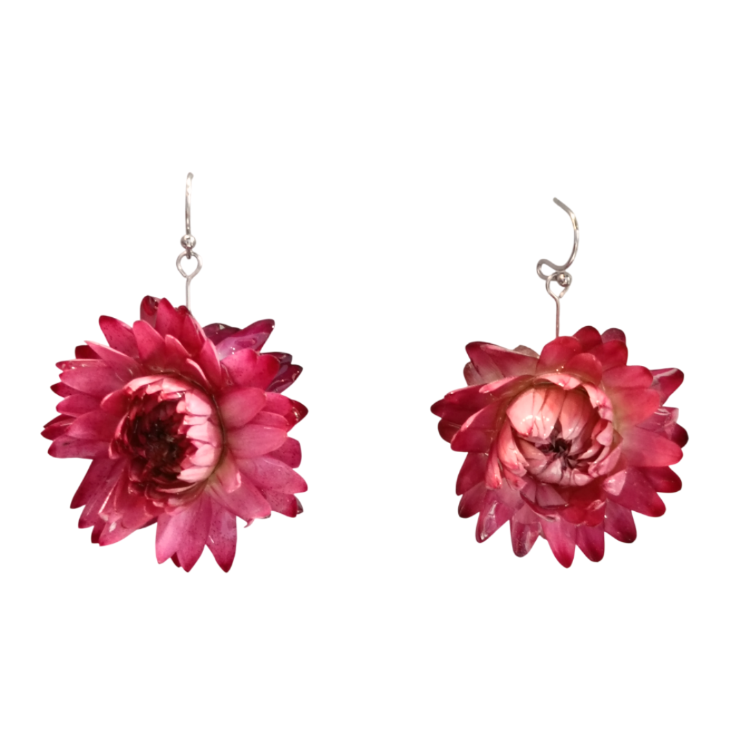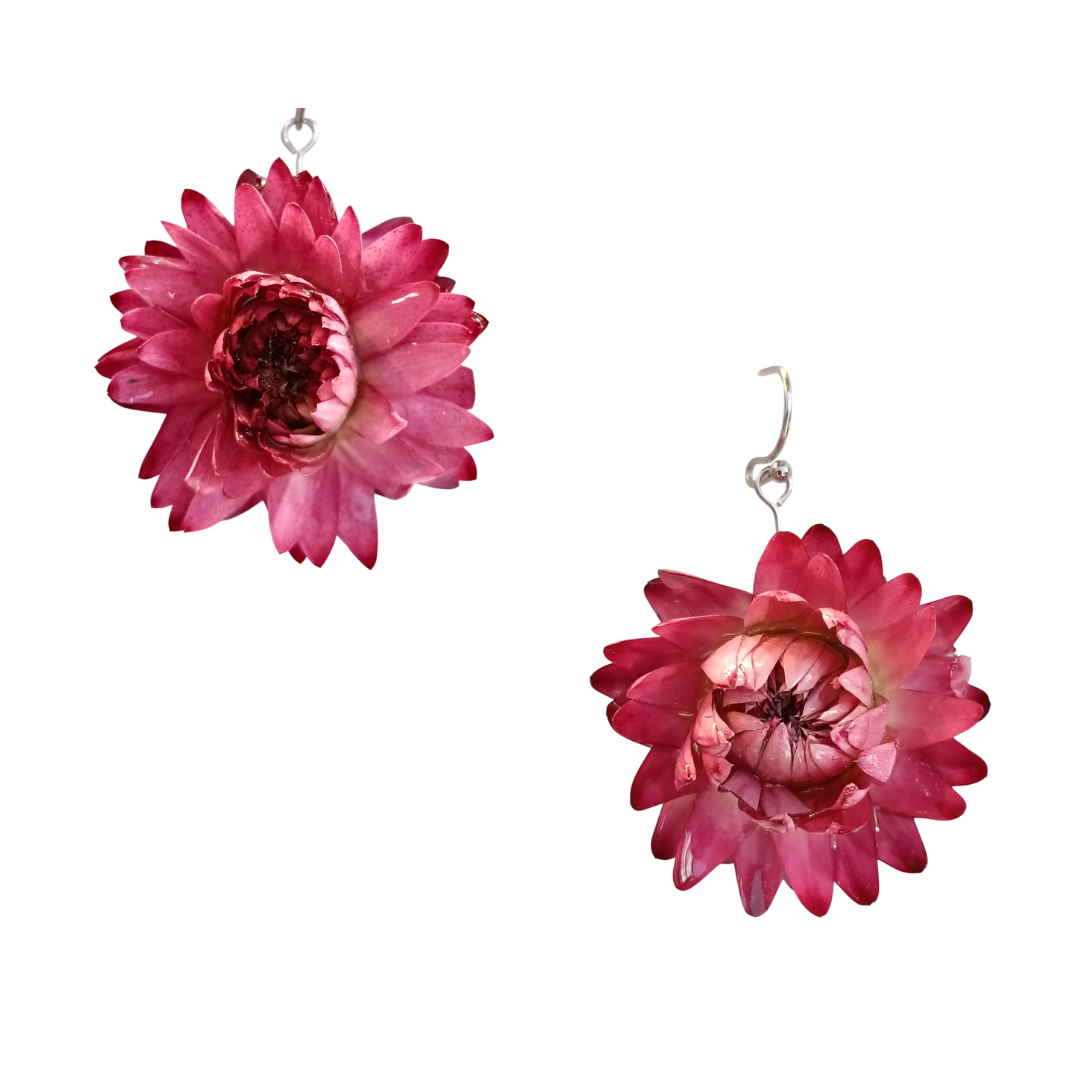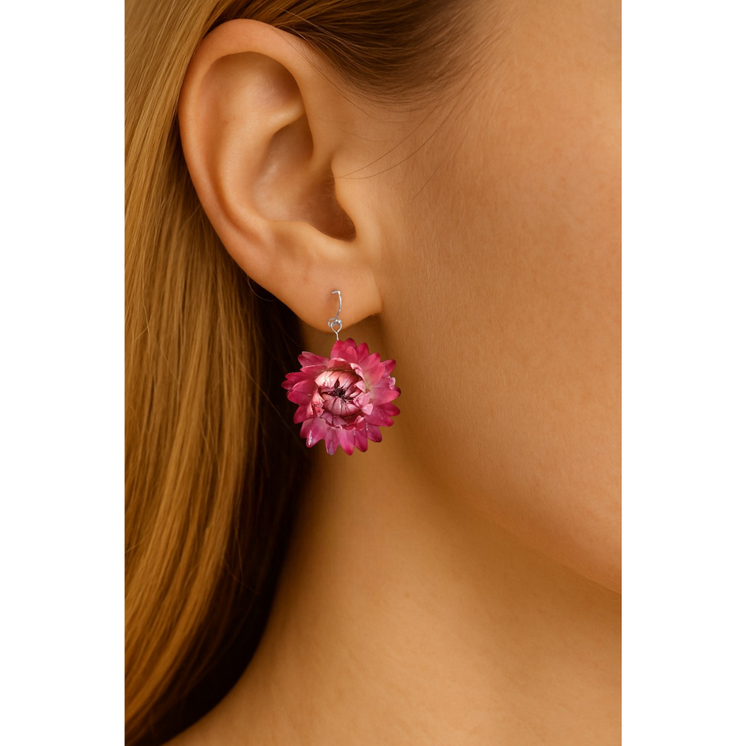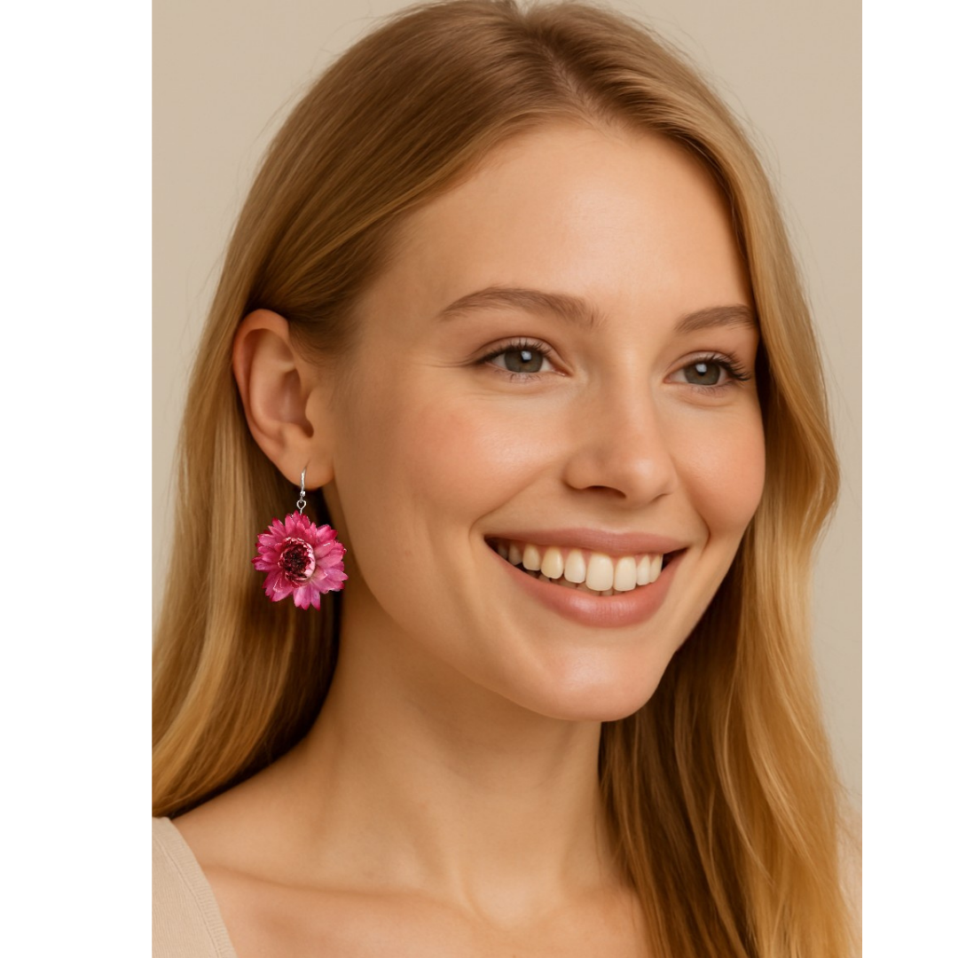 Cada peça é feita com flores naturais secas, escolhidas e tratadas com cuidado, e depois cobertas com resina para preservar a sua forma, cor e delicadeza. O resultado é um brinco com presença — rosa/fúcsia, vibrante, luminoso — e com aquela sensação de “peça única” que só a natureza consegue criar.